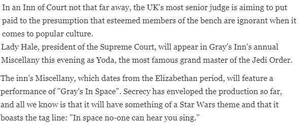 It was reported that Lady Hale, president of @UKSupremeCourt, was to appear in @HonSocGraysInn’s annual Miscellany as Yoda from Star Wars…